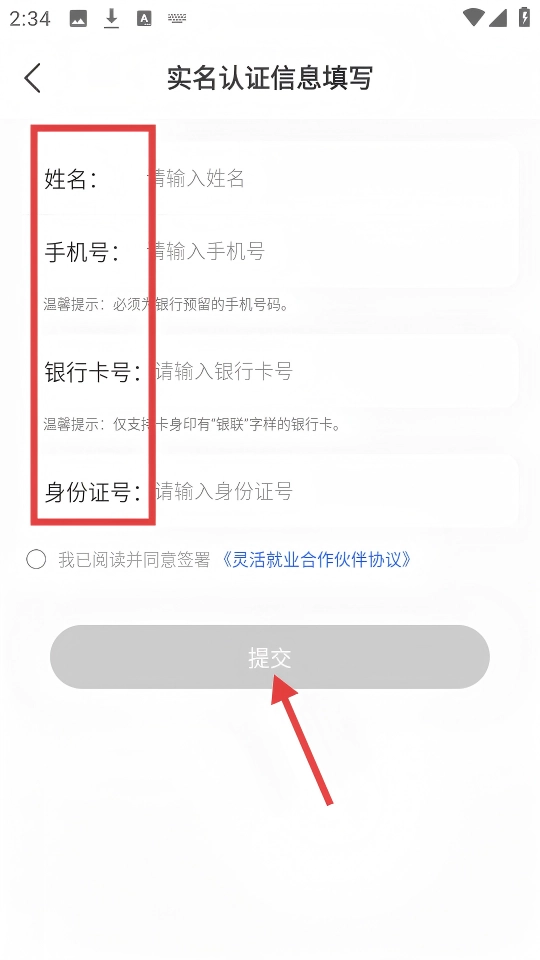 4、在【实名认证信息填写】页面,填写【姓名】【手机号】等信息,勾选协议后点击【提交】。
