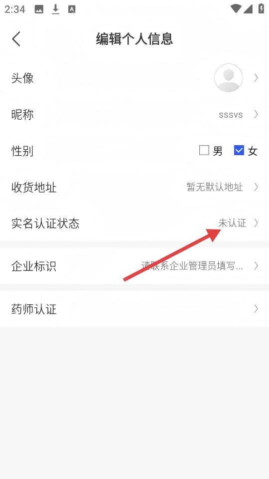 3、在【编辑个人信息】页面,点击【未认证】,可进入实名认证信息填写页面。