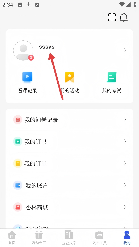 2、在【我的】页面,点击昵称【sssvs】区域,可进入编辑个人信息页面。