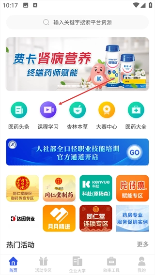 1、进入【首页】,找到【课程学习】功能入口,点击进入课程列表页面。