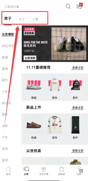 2、分类页面依据性别和年龄对商品类别进行划分,设有男士专区、女士专区以及童装区域。