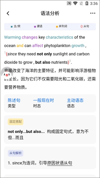 语法分析——该部分内容包括句子翻译、时态和语态的识别、从句及语法结构的解析,以及相关词汇。特别是对语法结构的解析非常详尽。句子中的主语、谓语和并列词会用不同颜色的字体标出,让人一目了然。