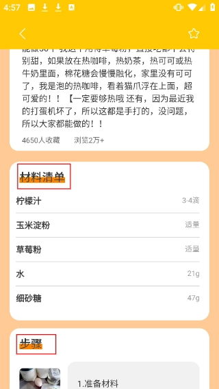 4、在【猫爪棉花糖】详情页面,可查看该菜品的【材料清单】与【步骤】等信息。