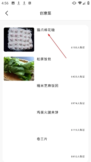 3、在创意菜列表页面点击【猫爪棉花糖】条目,进入该菜品的详情页面。