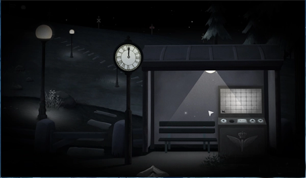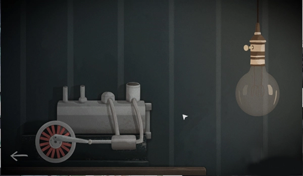 在这个场景里,我们能看到钟和火车路线图这两个关键物品。仔细观察火车的操作装置,会发现它缺少了一个向右的按钮部件,按常理来说,这一步应该先去寻找这个缺失的按钮。不过好在这个游戏的解谜步骤没有严格的先后限制,所以我们可以按照从左到右的场景顺序来一步步解开谜题。