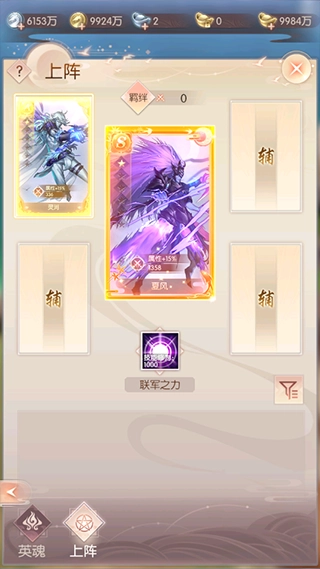 英魂上阵:对于未上阵英魂的位置,选中该位置,点击左侧列表任意英魂,将对应英魂上阵到对应位置。