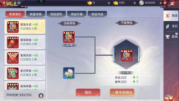 强化是提升装备属性的基础操作,能有效增强装备的主属性能力。其花费相对较低,只需玩家消耗足够银币即可进行。强化等级上限与角色转职相关,若想获得更多强化加成,玩家需提升角色等级。此外,强化界面左下角设有共鸣进度条,当装备总强化等级达到特定要求时,可激活共鸣效果,从而获得额外属性加成。