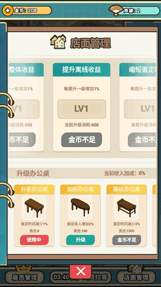 当金币积累到足够数量时,你可以更换办公桌,还能为店面添加增益效果;已经获得的办公桌,其外形可以随时进行更换。