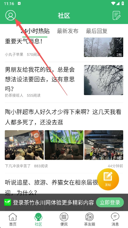 1、打开茶竹永川网,点击屏幕左上方头像。