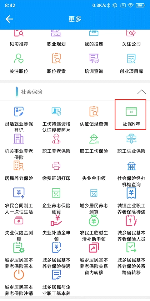 4、找到并打开社会保险板块下的“社保N年”功能入口,进入页面后输入对应的个人姓名和社会保障卡号码,最后点击下方的确认按钮完成操作即可。