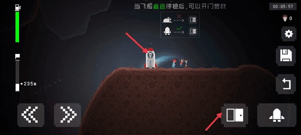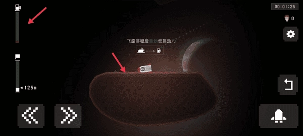 4、游戏的玩法就是发射火箭到每一个小区域,每个区域都有可能有幸存者,你需要将他们救出来,当飞船停稳后,左边红色箭头指向的燃料就会自动恢复过来。