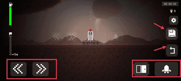 3、接下来介绍一下基本功能键,左边的是左右方向键,用来控制火箭的方向,右边是开舱门和发射按钮,红色箭头指向的功能一个是返回到初始状态,一个是用来存档。
