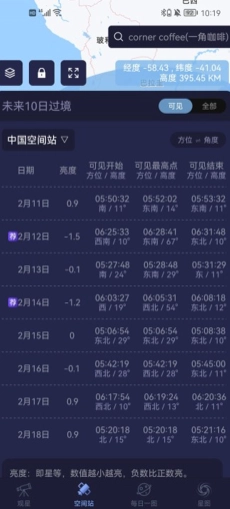 3.在“空间站”板块里,还能看到一些重要人造天体在你所在地区上空的过境时间,板块最下方则列有部分重要恒星的位置、状态以及视星等相关参数。