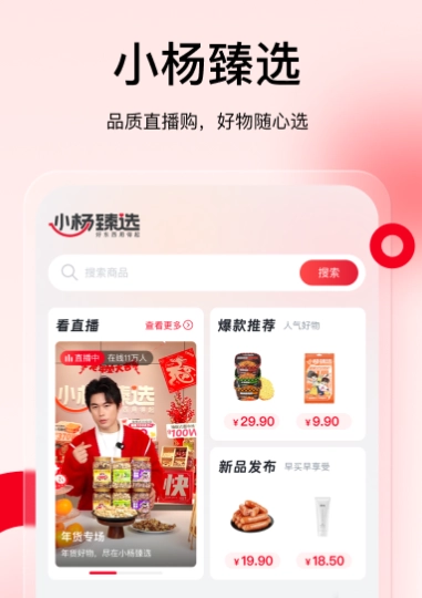 小杨臻选团购平台集结了由大小杨哥带队的「顶流主播天团」,大家可以尽情体验趣味十足的带货直播,实现边观看、边互动、边下单的轻松购物模式。