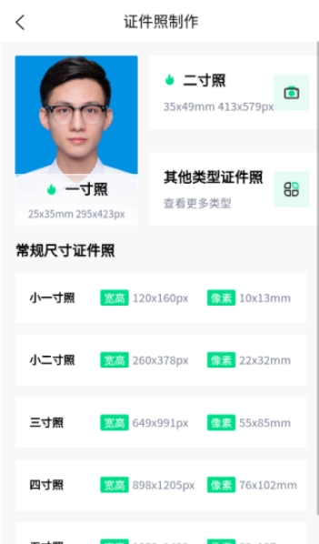 4、找到证件照功能并点击进入,接着挑选合适的尺寸,之后可以选择直接拍摄照片,或者从相册里选取已有的照片,最后对照片进行美化处理,这样就能完成证件照的制作了。