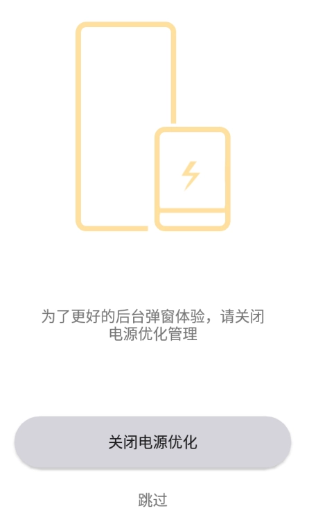 若想让后台弹窗功能更顺畅地运行,建议您关闭设备的电源优化管理设置(此步骤非强制要求,若您不愿调整,直接点击“跳过”即可)。具体的操作指引如下: