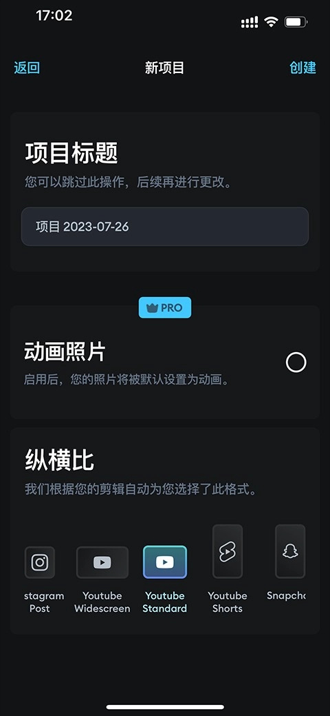 在这里可以选择项目标题、设置动画照片,还能进行格式选择,完成这些操作后点击“创建”按钮就可以了。