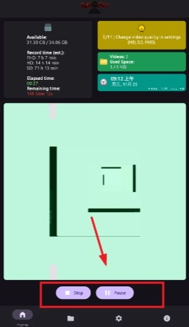 用户能够通过点击stop来终止录制操作,也可以点击pause暂停录制进程。