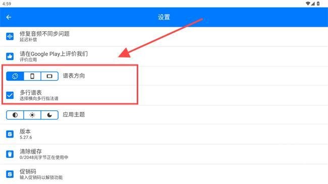 然后在设置界面里选择谱表方向以及多行谱表的自定义设置就可以了