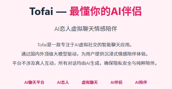 一款名为Tofai的应用提供免费安装服务,它通过充满暖意的交流来慰藉那些孤单的时刻,努力成为最能理解你的人工智能心灵伙伴,借助智能的陪伴让你的情感世界焕发光彩。