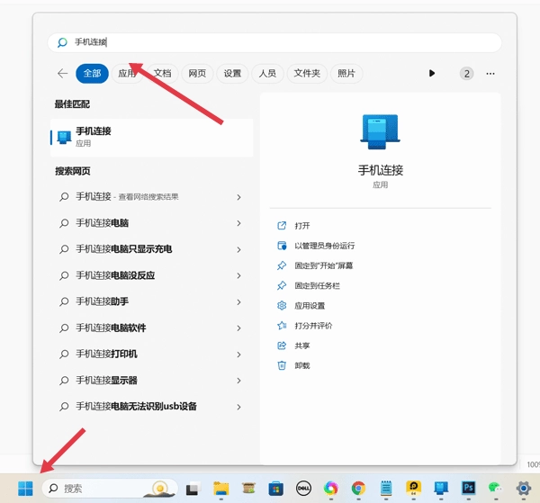 在您的电脑上,点击“开始”按钮,输入“连接手机”并打开电脑里预装的这个应用程序。