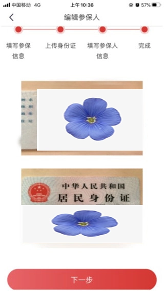 请提交参保人员身份证的正面与背面影像文件,待系统确认文件上传无误后,点击界面上的“下一步”按钮继续操作。