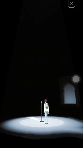 4、等平台停止转动后,回到最初的位置,能看到一个话筒。此时我们需要对着手机说话,并且要保持声音的连续性。试着持续发出“啊”的声音一会儿,之后墙壁上的眼睛会再次显现。等平台转回原来的位置,我们就可以追出去了。