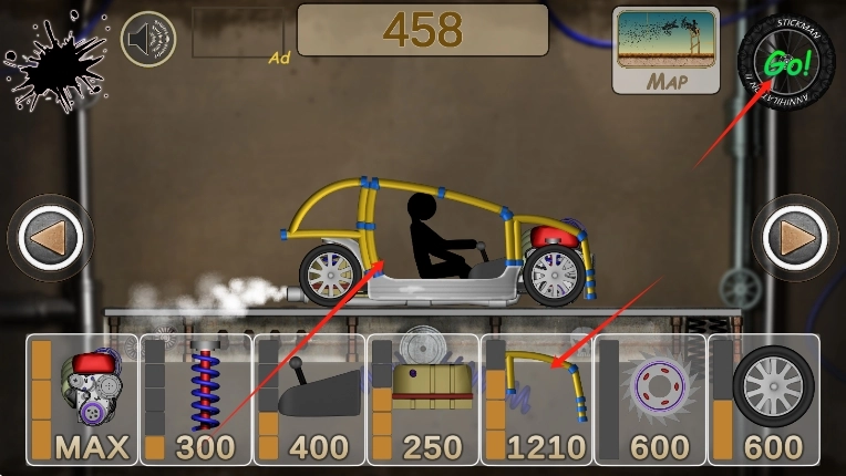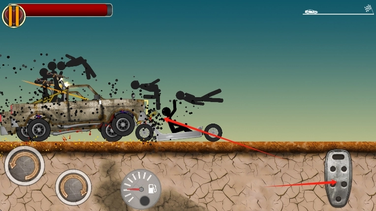 进入游戏界面后,选择初始火柴人角色驾驶一辆破旧的吉普车,在第一关的城市街道上遭遇了首批持枪敌兵的拦截。