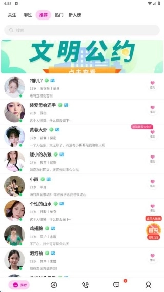 愉快搭是一款超棒的线上社交软件!它支持安全登录,随时都能开启对话。平台上有很多年轻人,主打真人陪伴模式,让你可以放心体验。在这里,你能一键查看自己的个人名片,还能完善个人资料。系统会根据每个用户的情况,推荐最合适的交流对象。就算是刚加入的新人,也绝对不会感到无聊!