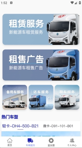 3.点击页面下方的“车辆服务”选项,就能看到租赁服务、租售广告、换车服务等相关功能。
