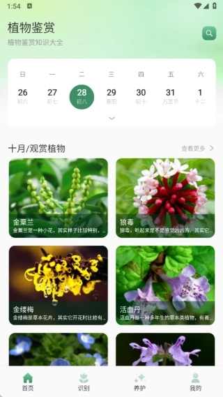 1、首页会展示十月的观赏植物,且每个月呈现的植物都各有差异;