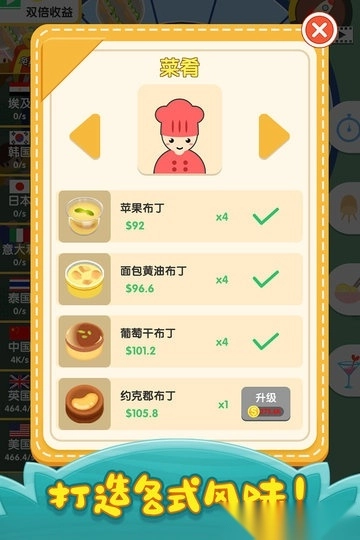 用手指轻点屏幕,就能对大厨、菜品、餐厅装潢、上菜效率等进行升级,进而获取更多金币。当积累的金币达到一定数量时,便可以开启新的餐厅,迎接下一关卡的全新挑战。