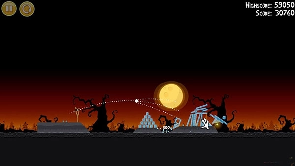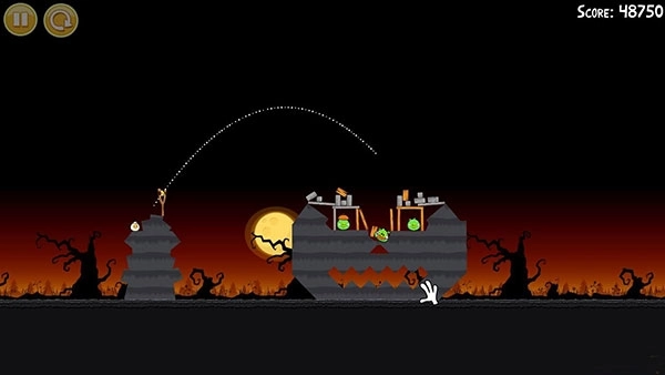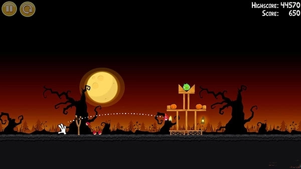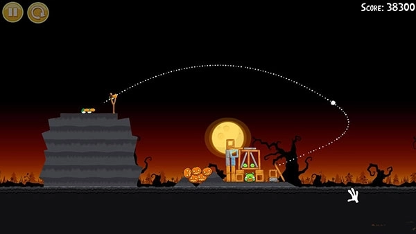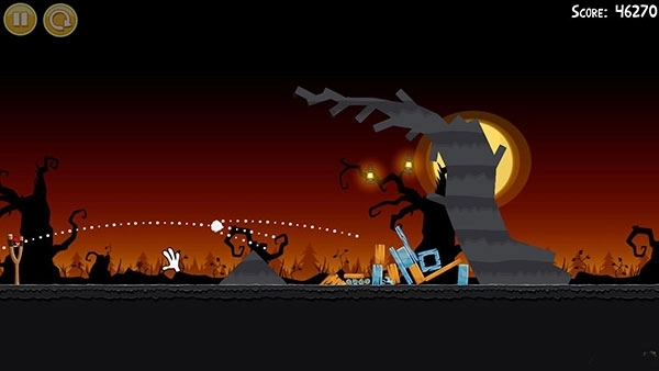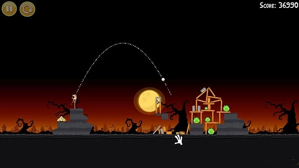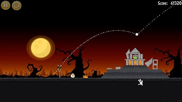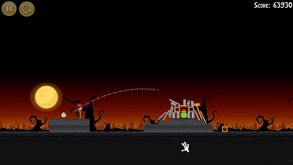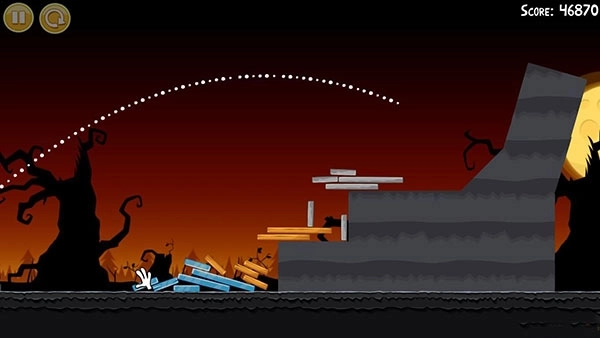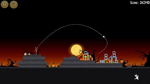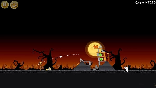 1-6:关卡的打法是:第一只鸟瞄准图里的轨迹点发射,击中左下角,打掉一个南瓜头;第二只鸟也以特定角度斜着冲向南瓜所在位置。(想拿三星真的全靠运气,我反复试了七十多次才成功,这过程也太煎熬了吧!)