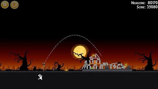 1-13:关卡攻略:第一只回旋鸟沿图中轨迹飞行,可击溃建筑主体(存在一鸟全灭的概率);第二只鸟的投放位置与第一只相近,只需击中位置稍往上一点即可,关键是要让左侧石砖倒向南瓜堆,务必砸中南瓜堆,不然无法达成三星评价!