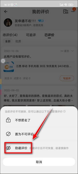 6、可以选择隐藏评价,对付这种无法删除的评价,也是同样的效果