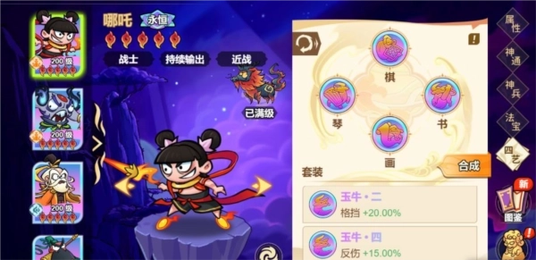 装备系统:武器,头,衣服,首饰(四个部位),神将等级达到60级后所有部位即可解锁,每件部位可提供不一样的神将属性。
