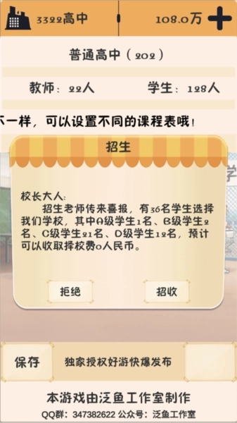 点击招收后,就能看到招收效果,学校的学生分为SABCD等多个等级,等级越高的学生学习越好。我们所设定的招生500人目标完成后,就可以开学了。