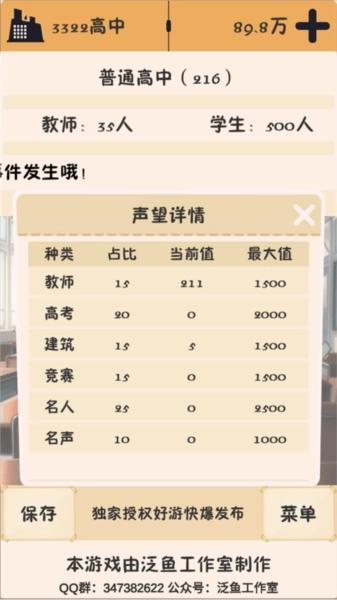 这是一个以不破产的前提下提升声望的游戏,教师声望要特级教师才给,高考就是学生考上顶级会有,(素质与考上国外大学有关,社团全点,感觉社团一点也不影响奥赛,后期点不点都是2个一等奖)。