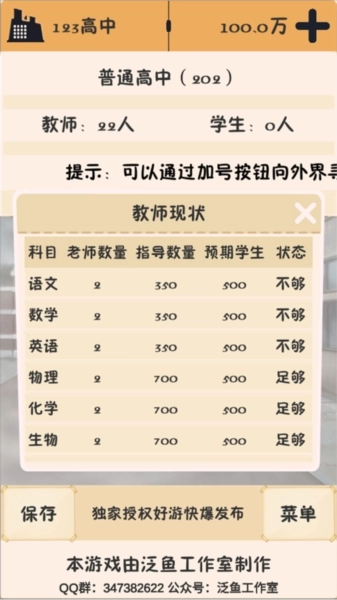 5、点击右下角的菜单,再点击教师,现状,就能看到目前的教师和学生的比例是否合理。我们可以看到,语文、数学、英语老师不够,那么就需要招收新的老师。点击菜单、学校、政策,在里面就可以选择招募老师。招到合适的老师,我们就点击雇佣即可。招了三个老师后,再看就能发现教师资源已经足够了,这样有利于学生们学习成绩的提升。