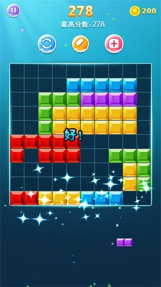 把屏幕下方的三个候选方块拖到方格里面,只要一行或者一列被完全填满就能消除,一直玩到候选方块没办法放进去的时候,消除游戏就结束了。