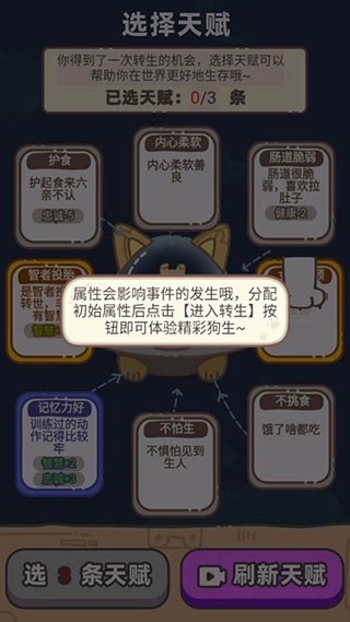 4、每次重生前,系统会随机抽取若干个天赋,像“乖巧”“爱翻垃圾桶”“速度飞快”“抗压强”这类,玩家要从里面选出三项最匹配的组合。