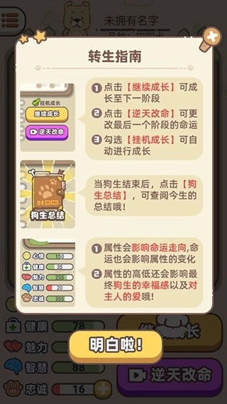 5、狗狗的初始属性涵盖【智力】、【体力】、【亲和力】、【好奇心】与【忠诚度】等多个方面。玩家能够依据自身期望的发展方向自主分配点数,打造出独具特色的狗狗性格。
