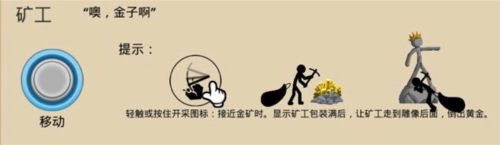 矿工:轻触或按住开采图标:接近金矿时。显示矿工包装满后,让矿工走到雕像后面,倒出黄金,完成收集。