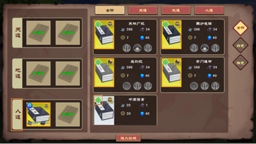 论战需要装备1~6本书籍,将每本书籍按照类型,分别装配到天、地、人,三道,攻击力的高低也取决于书籍的品质,品质越好的书籍伤害也就越高