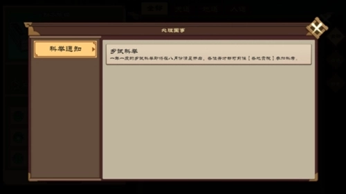 每年的八月会进行乡试,公告会提前三个月出来提示,所以在这段时间里我们可以攒钱,去提升自己属性和购买高级的书籍,为乡试备战!!!