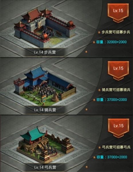 三个兵种兵营的建造顺序主要由你上阵的武将决定。要是你有孟获,那就优先把步兵营的等级升上去;要是你打算派两名骑兵将领出战,那就先升级骑兵营。
