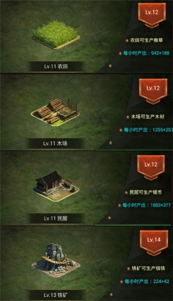 资源会影响建筑升级、募兵和国器升级,所以建筑空闲时记得升级资源田,其中优先升级铁矿和农田,因为银币和木材打流寇就能获得,只要有时间,一小时打300k银币完全没问题。在未上州之前,粮草除了自行生产外,只能通过攻打其他玩家掠夺获取,但掠夺需要士兵,而招募士兵又需要粮草,这是环环相扣的问题,所以空闲时记得升级农田。镔铁在游戏中无法被掠夺,但升级国器必不可少,因此这两者的升级顺序由玩家自行决定。