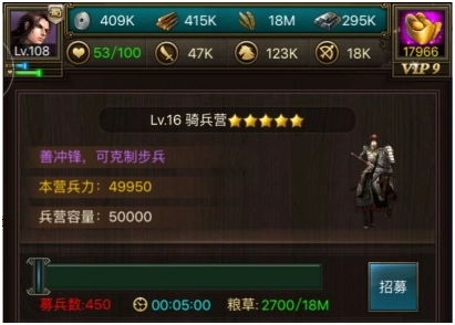 兵营能提升士兵的容纳上限,这样在战斗时就不会因为士兵不足、还得等待招募时间而错过出战的时机。右下角的募兵加时功能很关键,要是你不是那种能开很多招募队列的土豪玩家,建议至少买到50分钟的时长。另外,招募队列也推荐多开1到2行,虽然需要花费200元宝或者400元宝,但能节省不少时间。