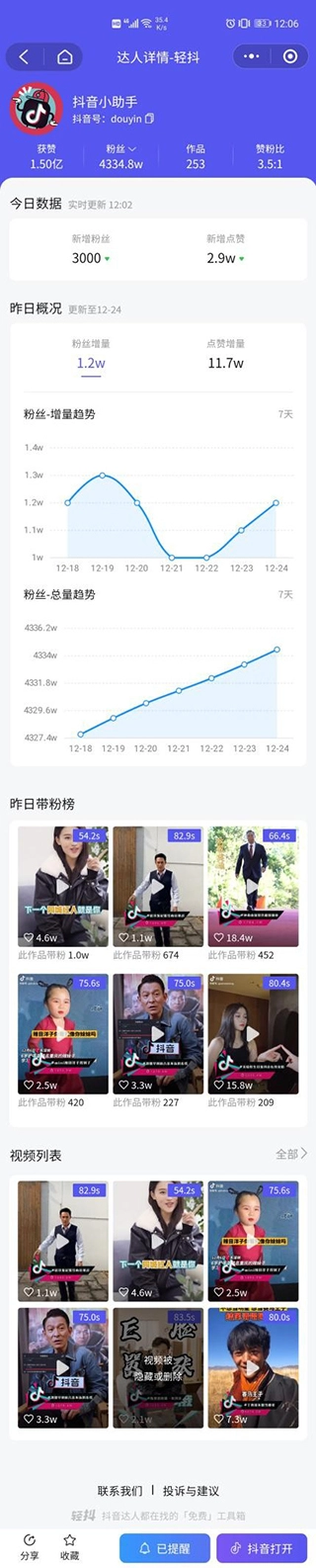 轻抖绑定抖音账号后,在达人详情页面上就可以看到具体的抖音数据。