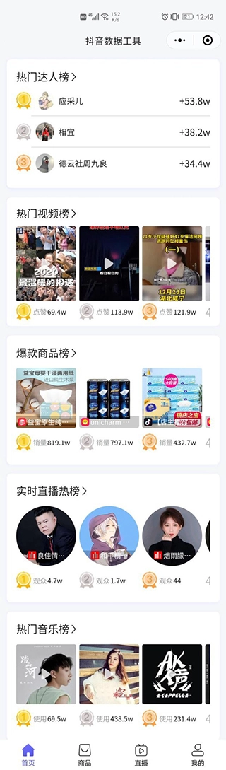 数据服务:达人榜单、视频榜单、热点话题榜、音乐榜、数据趋势分析